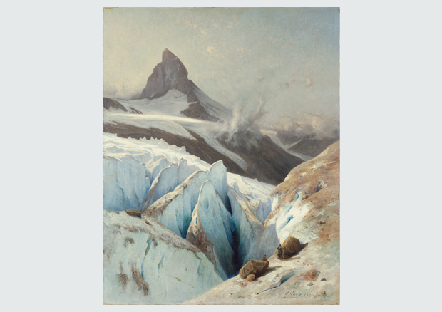 Das erste Bild, auf das wir in der Ausstellung stossen, ist Ferdinand Hodlers monumentales, mehrteiliges Werk «Absturz IV» (1894), das üblicherweise im grossen Saal des Alpinen Museums hängt. Es zeigt die Erstbesteigung des Matterhorns 1865 und, nach dem Sturz eines Mitglieds, den tödlichen Fall eines Teils der Seilschaft. Eine Metapher für Hochmut, vergleichbar dem Absturz von Ikarus in der Antike; der junge Mann kam im Flug der heissen Sonne so nahe, dass das Wachs schmolz, mit dem die Federn seiner künstlichen Flügel befestigt waren. Er stürzte ins Meer.