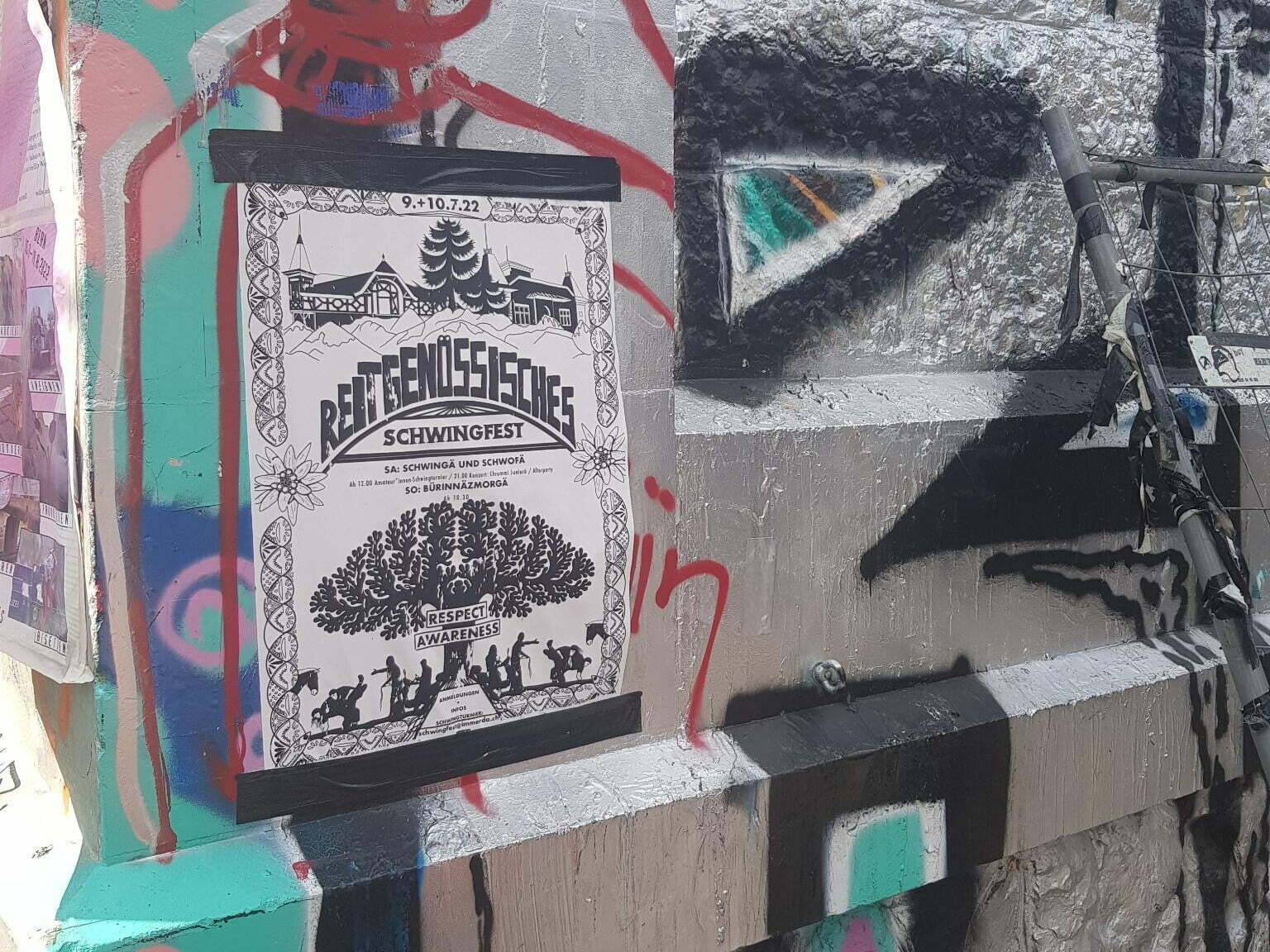 Nach der sonst eher pragmatischen und speditiven Sitzung kommt nun eine beinahe aufgekratzte Vorfreude auf. Noch immer ist es jedoch kaum vorstellbar, hier im Innenhof zwischen Graffitis und Anarchiezeichen bald Sägemehl und Schwinghosen zu sehen. Vielleicht einen Lebendpreis? Ganz bestimmt einen Brunnen, der irgendwo gluckern wird. Es wird sich kommenden Samstag zeigen, ob und wie das läuft – ein Schwingfest im autonomen Jugendzentrum.