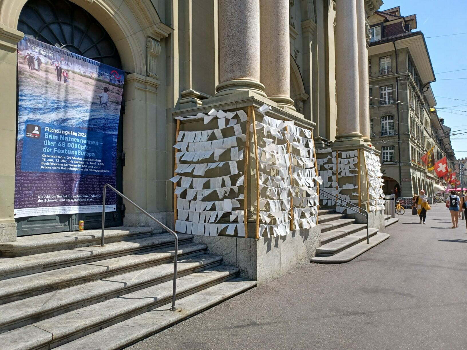Samstagnachmittag in der erhitzten Stadt. Unter dem Baldachin und am Loeb-Egge pulsiert das pralle Leben. Um die Heiliggeistkirche hängen an Holzgerüsten zehntausende weisse Stofffetzen mit den Namen Geflüchteter, bauschen sich im seltenen Wind, bilden eine Art Federkleid zu Ehren der Menschen, die auf der Flucht gestorben sind. «Beim Namen nennen» heissen am Flüchtlingstag mehrere Aktionen, die im Umfeld und im Innern der Kirche stattfinden.