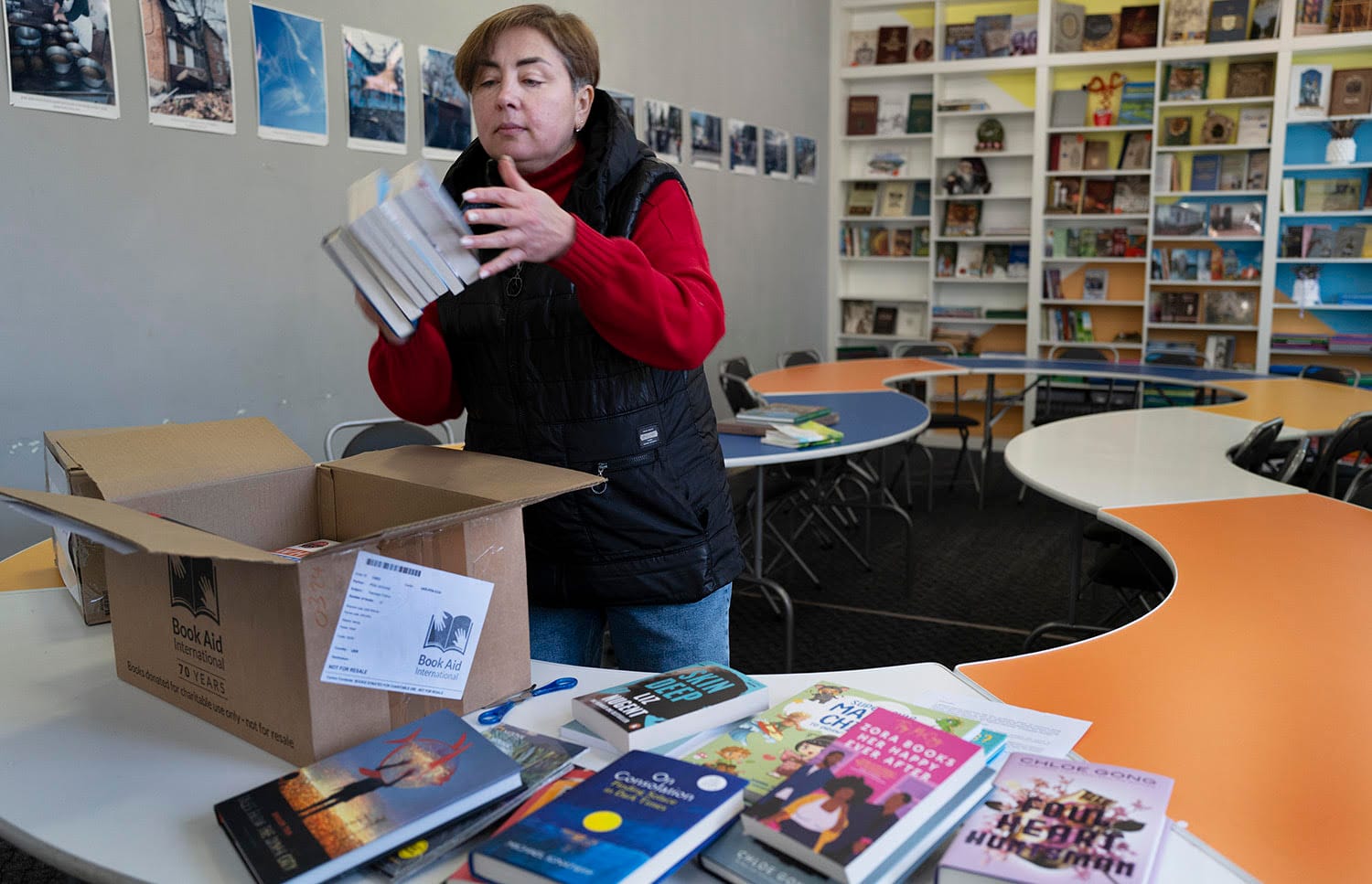 Die Fotos von Åke Ericson zeigen diese Realität des Krieges auf eindrückliche Weise: Da sind die Mauern einer zerstörten Bibliothek zu sehen, die Spuren eines Drohnenangriffs vor einer Kinderbibliothek, die Ruinen des Kulturhauses in Jahidne. Aber Åke Ericson zeigt in seinen Aufnahmen auch, wie die ukrainischen Bibliotheken im Krieg eine neue, wichtige Rolle übernehmen. Wie Schutzräume im Keller von Bibliotheken eingerichtet wurden, in denen Kinder bei Luftangriffen zur Schule gehen können. Wie eine Bibliothekarin Kisten mit Büchern auspackt, die Book Aid International, eine britische Organisation, geliefert hat, um die Bestände ukrainischer Bibliotheken aufzufüllen. Wie in Bibliotheken therapeutische Angebote stattfinden: Yogakurse oder Kunsttherapie.