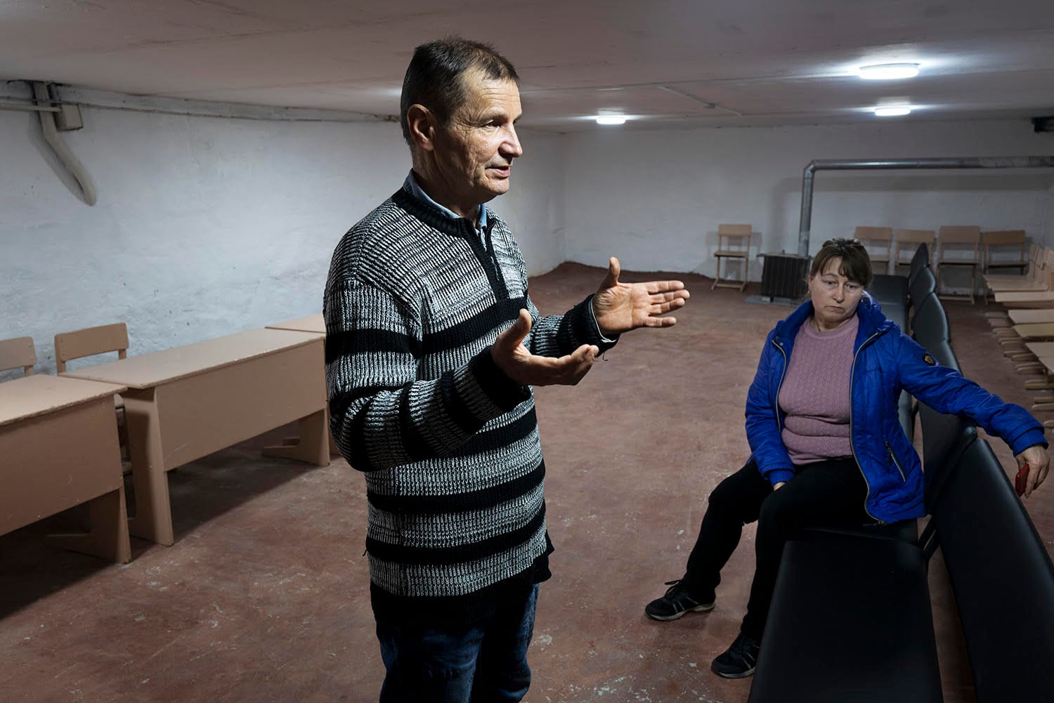 Das Foto zeigt mehrere Frauen und einen Jungen im Korridor einer Bibliothek. Einige Frauen unterhalten sich fröhlich, während der Junge angespannt ins Nichts starrt. Alle warten auf etwas, was die Betrachtenden nicht sehen können. Wie Fotograf Åke Ericson auf dem Rundgang durch die Ausstellung erzählt, sollte in der Bibliothek im ukrainischen Ripky eine Buchdiskussion stattfinden. Jedoch sei kurz zuvor ein Luftalarm losgegangen und die Besucherinnen hätten die «Zwei-Wände-Regel» befolgt – wenn es keine Möglichkeit gibt, einen Schutzraum aufzusuchen, sollte man zwei Wände zwischen sich und das Freie bringen.
