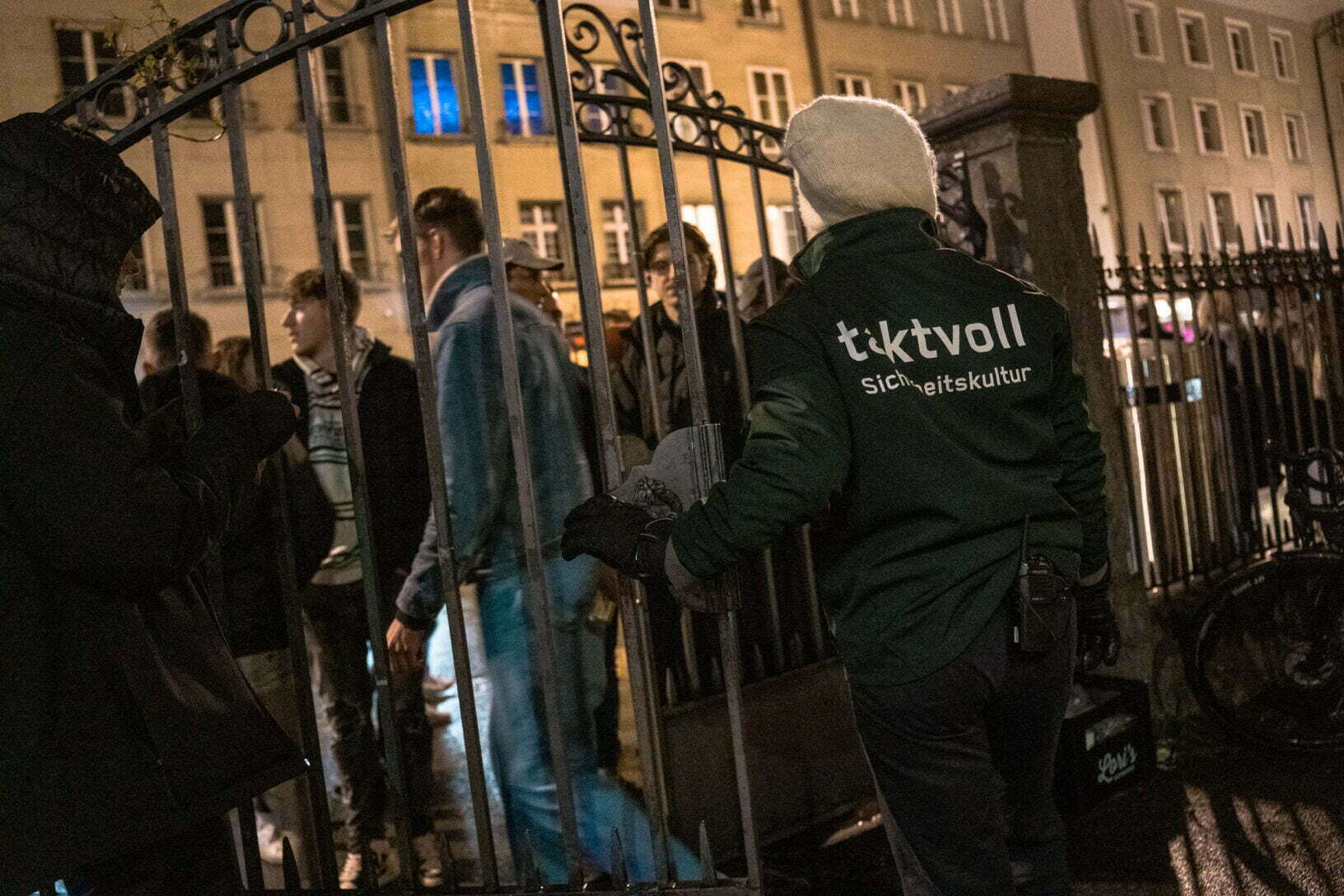 Um 21:45 Uhr beginnt der Arbeitseinsatz mit dem Briefing. Wir treffen das Team von Taktvoll vor der Turnhalle: sechs Türsteherinnen und zwei Türsteher – warm angezogen, Funkgerät und Pfefferspray am Gürtel. Es ist die einzige Waffe, die sie zur Selbstverteidigung tragen. Im Innenhof des PROGRs haben sich trotz des regnerischen Aprilwetters kleine Menschentrauben gebildet, drinnen hat der DJ sein erstes Set begonnen. Noch sind die Besucher*innen relativ nüchtern, die Stimmung aufgedreht, aber gut.