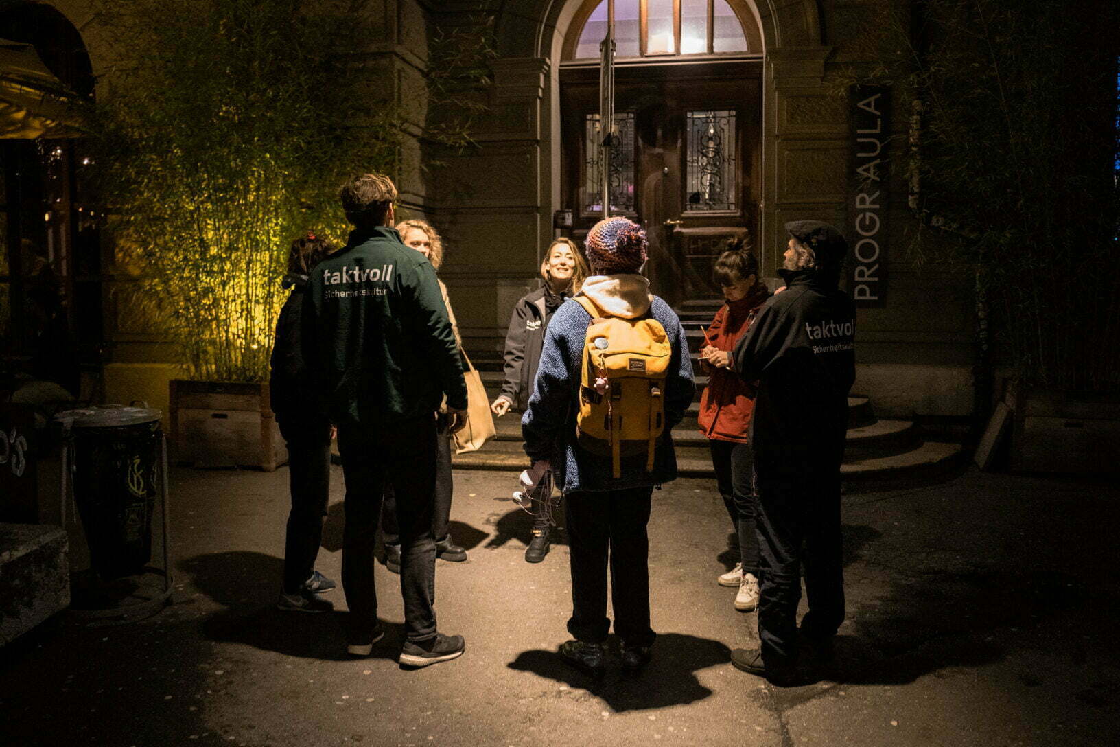 Taktvoll wurde 2018 von ehemaligen Mitarbeitenden des «Wellness»-Teams der Reitschule gegründet. Konflikte wollen sie vermittelnd und grundsätzlich deeskalierend handhaben. Mit ihrer dialogbasierten und inklusiven Sicherheitsphilosophie versteht sich Taktvoll auch als Kritik an einer Branche, in der Gewaltbereitschaft und Machismo in den eigenen Reihen keine Seltenheit sind. «Wir wollen, dass unsere Mitarbeitenden verstehen, in welchem Umfeld sie arbeiten und sich bewegen. Wir wollen empathische Menschen, die sich auch für die Kultur interessieren, die sie begleiten», erklärt Christoph Ris, einer der Mit-Gründer von Taktvoll.