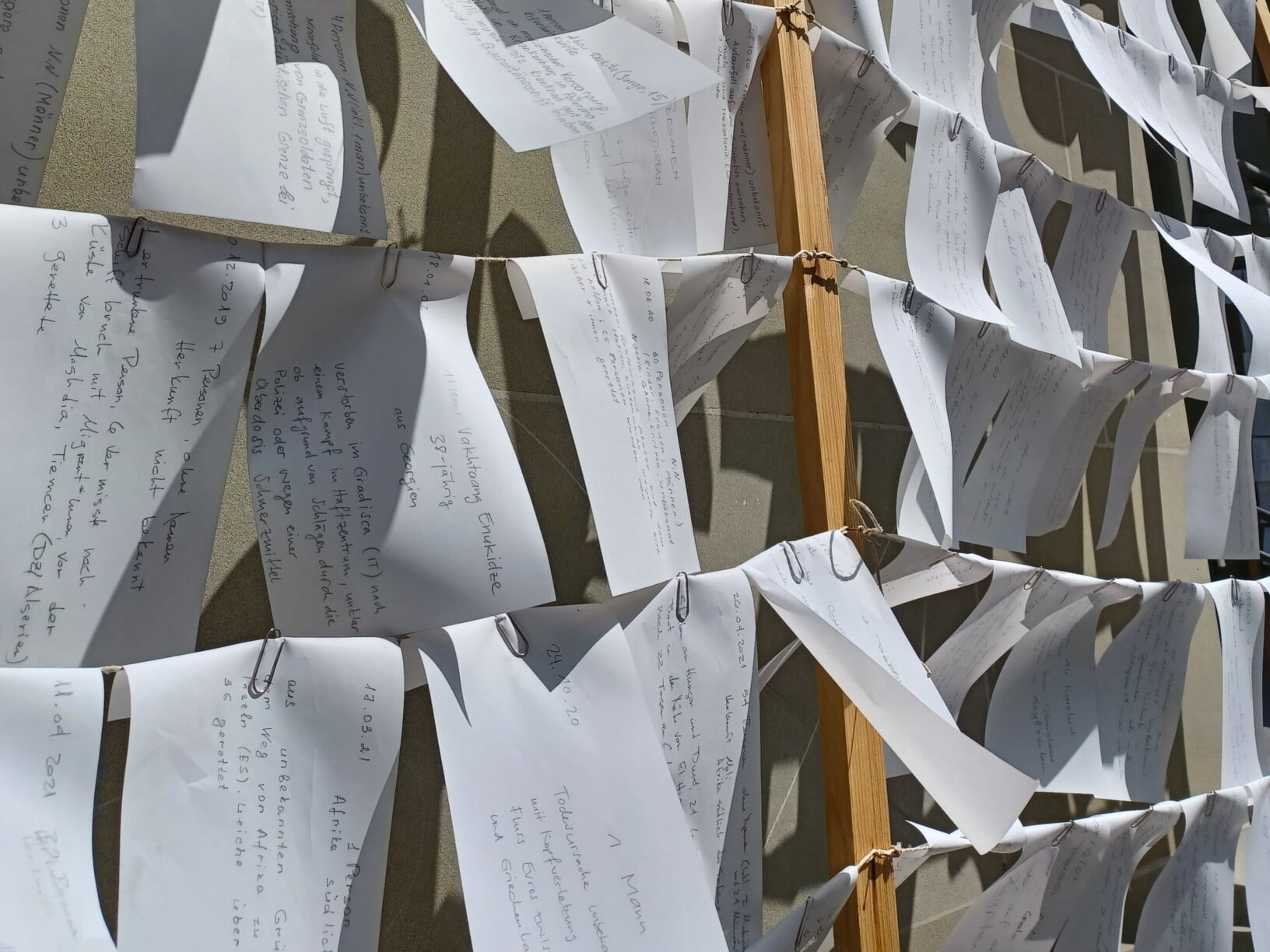 Weisse Stoffstreifen flattern in Reihen um die Heiliggeistkirche. Es sind tausende. Jeder Streifen erzählt stichwortartig vom Tod eines Menschen oder einer Gruppe auf der Flucht. Weitaus die meisten sind auf dem Mittelmeer ums Leben gekommen.