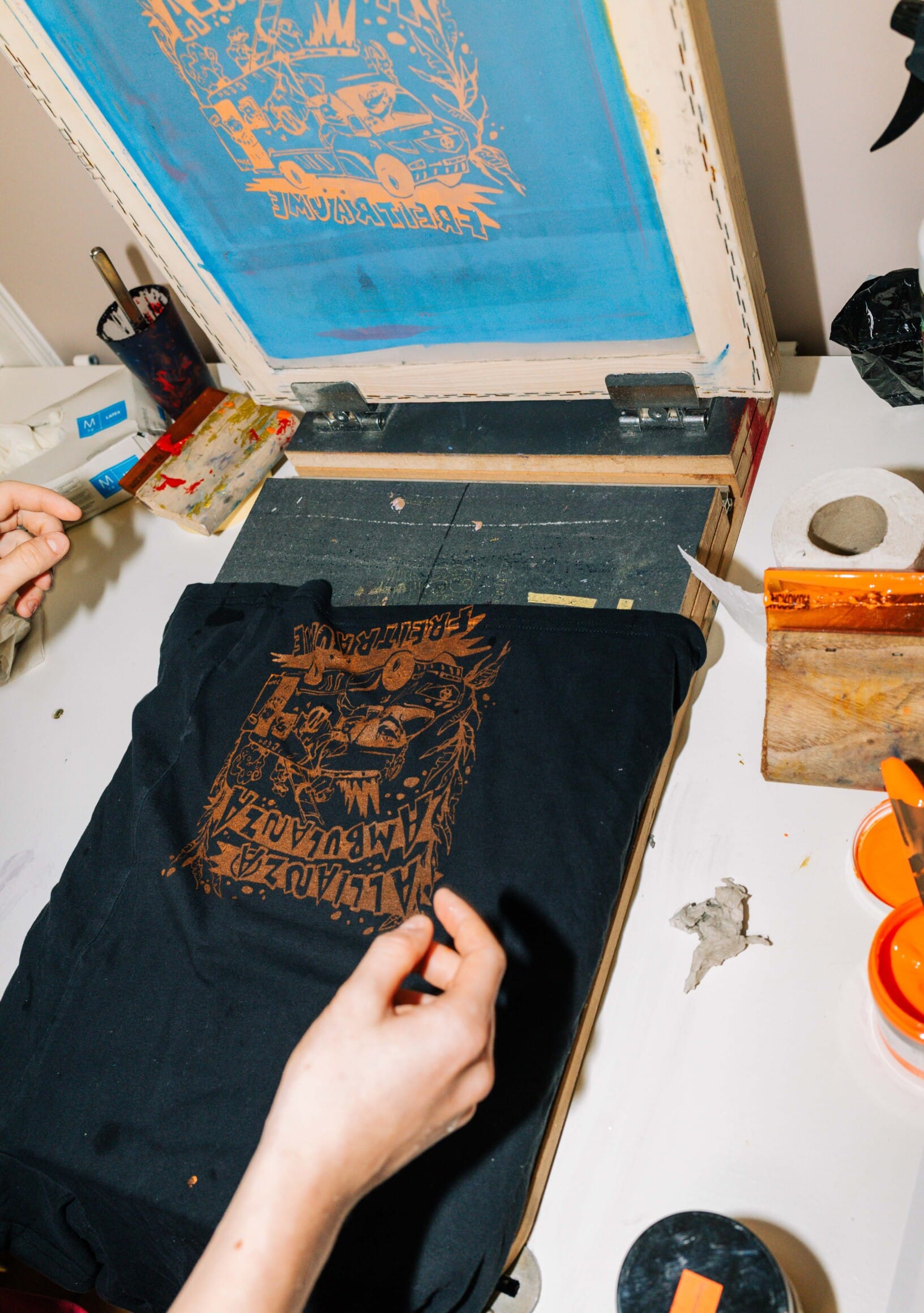 Ein Stockwerk darüber befindet sich unter anderem eine Küche, ein Flohmarkt, ein Malatelier und eine Siebdruckwerkstatt. Diese befindet sich im ehemaligen Badezimmer. Der eingebaute Föhn eignet sich bestens, um die frisch bedruckten Textilien trocknen zu lassen. Der Geruch von Farbe erfüllt den Raum.