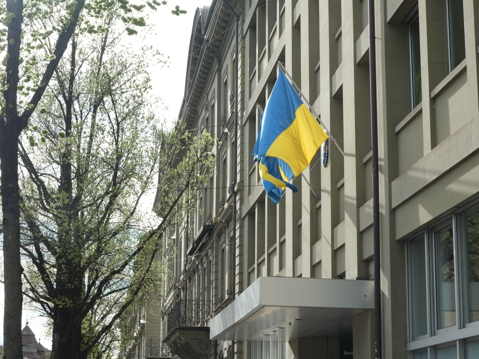 In Bern weht nur noch an wenigen Orten die ukrainische Fahne. Hier bei der schwedischen Botschaft. (Foto: Janine Schneider)