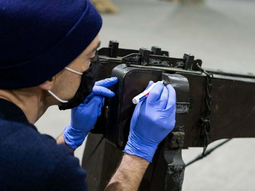 Die alte Inventarnummer wird bei der Übergabe von einem Mitarbeiter des Bernischen Historischen Museums durchgestrichen. (Foto: Nathalie Jufer)