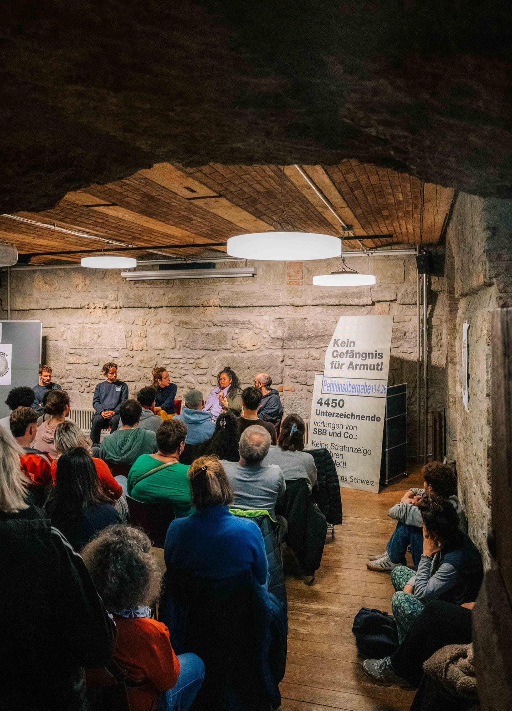 Nachdem die Petition am Nachmittag ihren Weg schliesslich doch noch ins SBB-Gebäude fand, wurde das Thema am Abend im Polit-Forum Bern an einer Podiumsdiskussion vertieft. Besonders eindrücklich war der Bericht von Katja, die selbst mehrfach eine Ersatzfreiheitsstrafe verbüssen musste.
