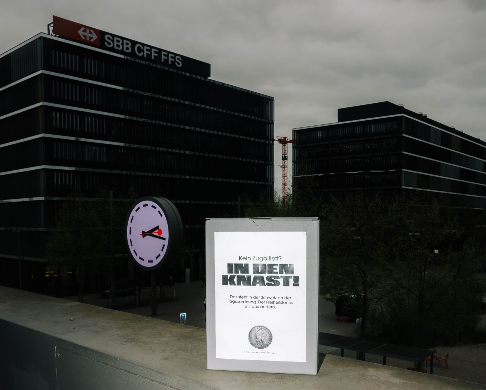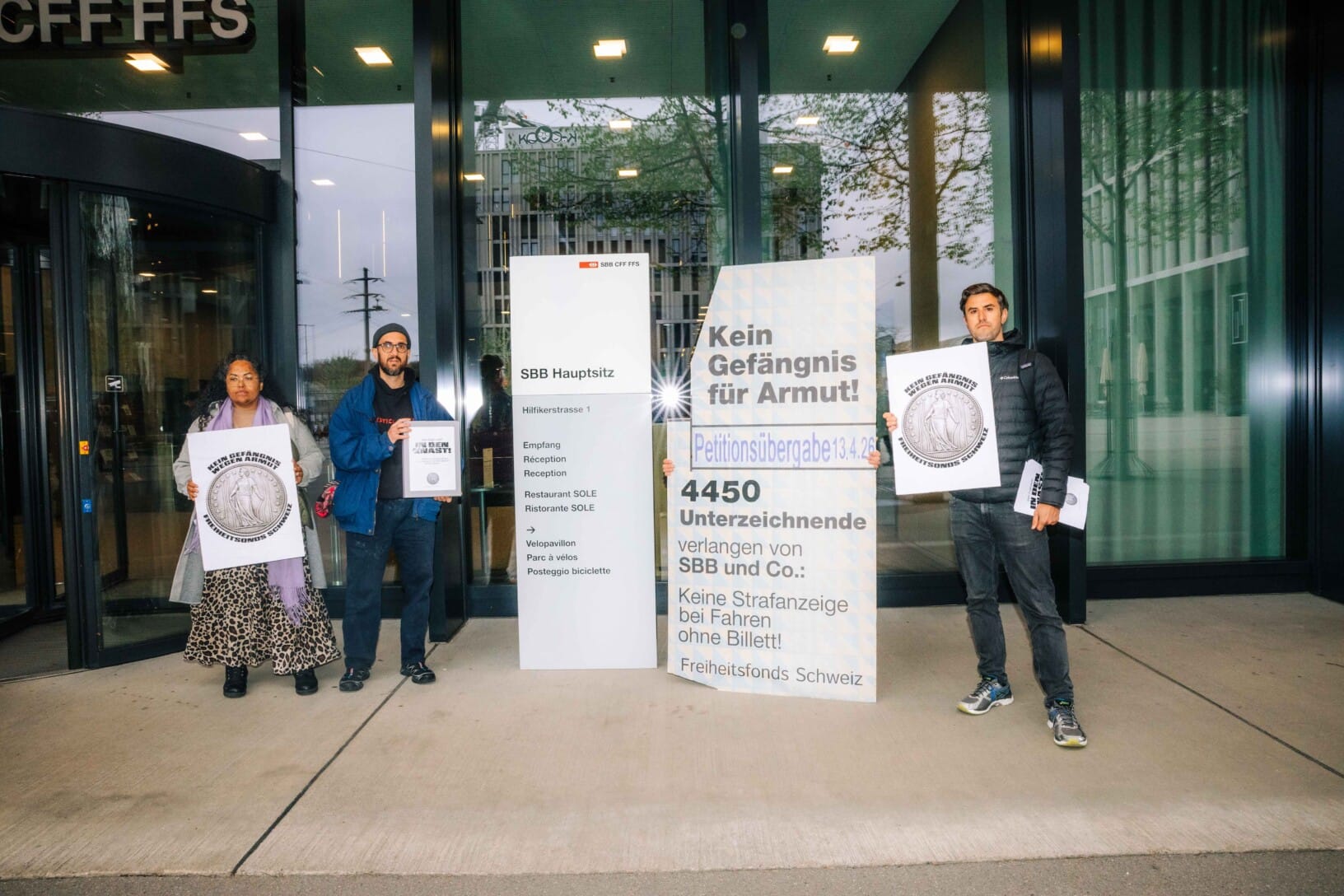 Ein knappes Dutzend Aktivist*innen treffen sich am Montag beim Hauptsitz der SBB im Wankdorf, um die Petition «Kein Gefängnis wegen Armut» zu übergeben. Hinter der Petition steht das Kollektiv Freiheitsfonds Schweiz, das die Ersatzfreiheitsstrafe abschaffen will. Kollektivmitglied Basil Weingartner kritisiert die Praxis klar: «Mit der Ersatzfreiheitsstrafe wird Armut kriminalisiert!»