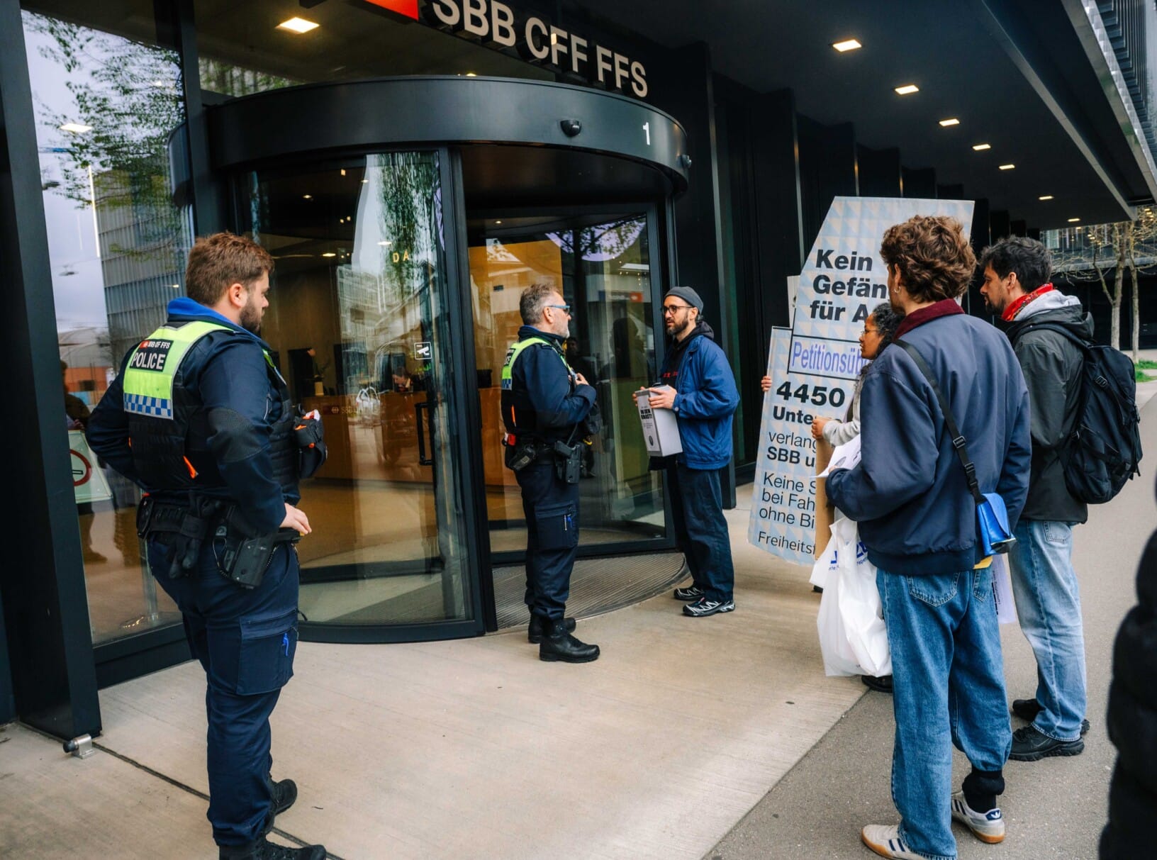Doch beim SBB-Hauptsitz an der Hilfikerstrasse werden sie von zwei Bahnpolizisten erwartet: Der Zutritt zum Gebäude wird verwehrt, offiziell entgegennehmen will die SBB die Petition nicht. Deshalb legt Weingartner die Unterschriften-Box in die automatische Drehtür. Und so werden die Unterschriften von der Drehtür ins SBB-Gebäude geschoben.