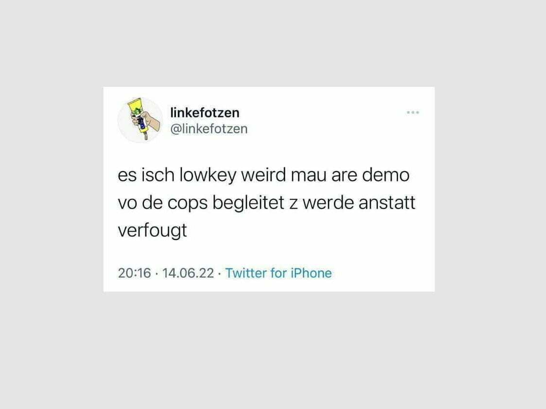 Als Gruppe kamen die «Linken Fotzen» während der Coronapandemie zusammen. Sie brauchten ein Ventil, um der Langeweile zu entkommen und ihren Frust mitzuteilen. Nach der Arbeit oder dem Studium, im Bus oder zu Hause entwickelten sie ihre «Memes», und zwar auf Schweizerdeutsch. Denn sie wollten ihre Stimmung vermitteln und nahbar sein – oder wie sie auf Englisch sagen: «relatable».