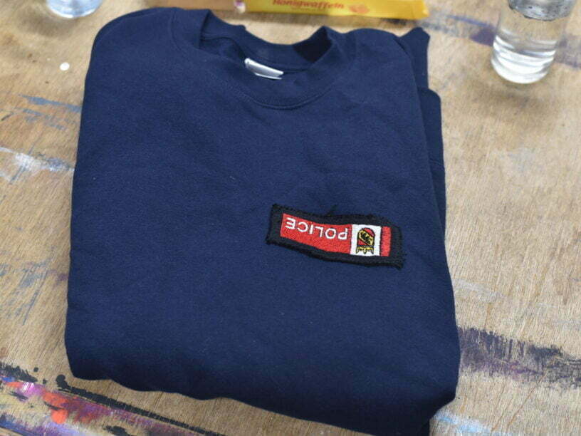 An einem Treffen im August 2020 erzählen Fabio und Ramon (Namen geändert) Journal B gegenüber erstmals ihren Teil der Geschichte. Die beiden engagieren sich je in einem – wie sie es selbst nennen – Berner Kunstkollektiv. Unter den Labels «Pouxa» und «Jeteur de Pierres» entstehen Kleiderkollektionen und Kunstaktionen im öffentlichen Raum. Die Inhalte sind oft politisch, subversiv bis dadaistisch und in ihrer Form unkonventionell. Bern ist klein und die entsprechende Szene, die die beiden Labels bedienen, ebenfalls. Die zwei Kollektive fanden sich vor einiger Zeit also für ein neues Projekt zusammen. «Wir hatten zu dem Zeitpunkt schon damit experimentiert, das Police-Logo auf Taschen zu sticken», erzählt Fabio, «und planten bald einmal, Sweater damit zu produzieren.» Das gemeinsame Projekt stand unter dem Begriff der Umordnung – das Sujet wurde auf den Kopf gedreht. Der geplante Pullover sollte nicht wie eine Uniform aussehen, so Ramon: «Wir wollten keine Polizeiverkleidung herstellen. Zu dem Markenrecht hatten wir uns damals keine Gedanken gemacht.» Die Gruppe hatte nicht erwartet, dass die paar Pullover von Interesse für die Polizei sein könnten, auch wenn eine Prise Provokation gewollt war.