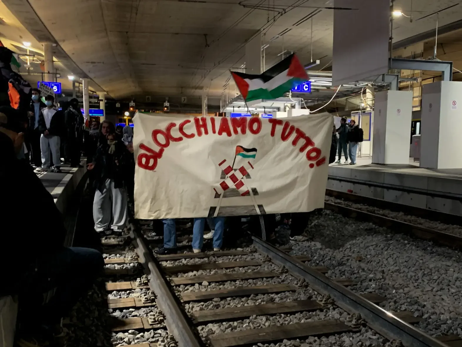 «Wir blockieren alles!» Mit dem Transparent nahmen die Protestierenden Bezug auf die palästinasolidarischen Proteste in Italien. (Foto: Noah Pilloud)