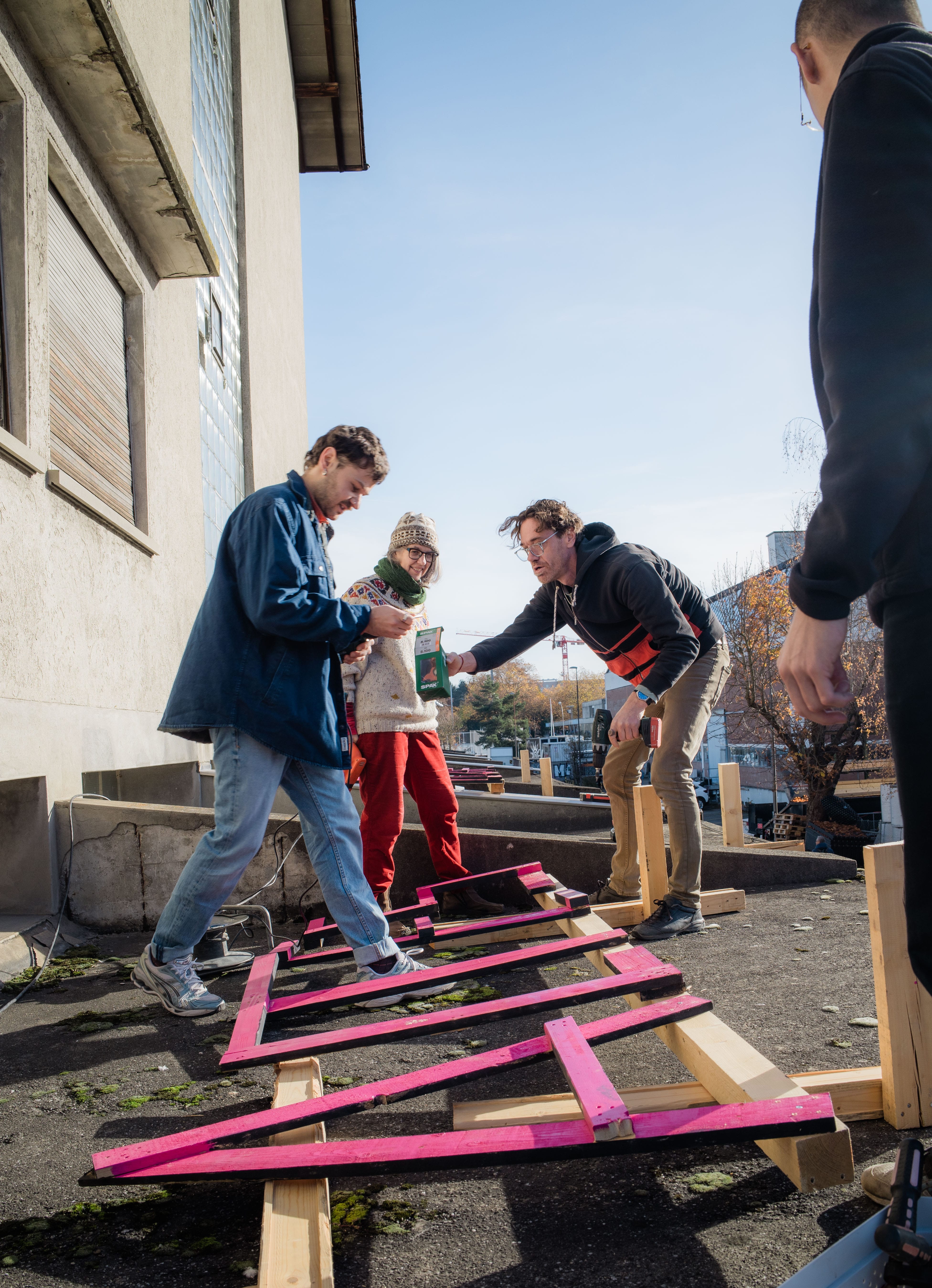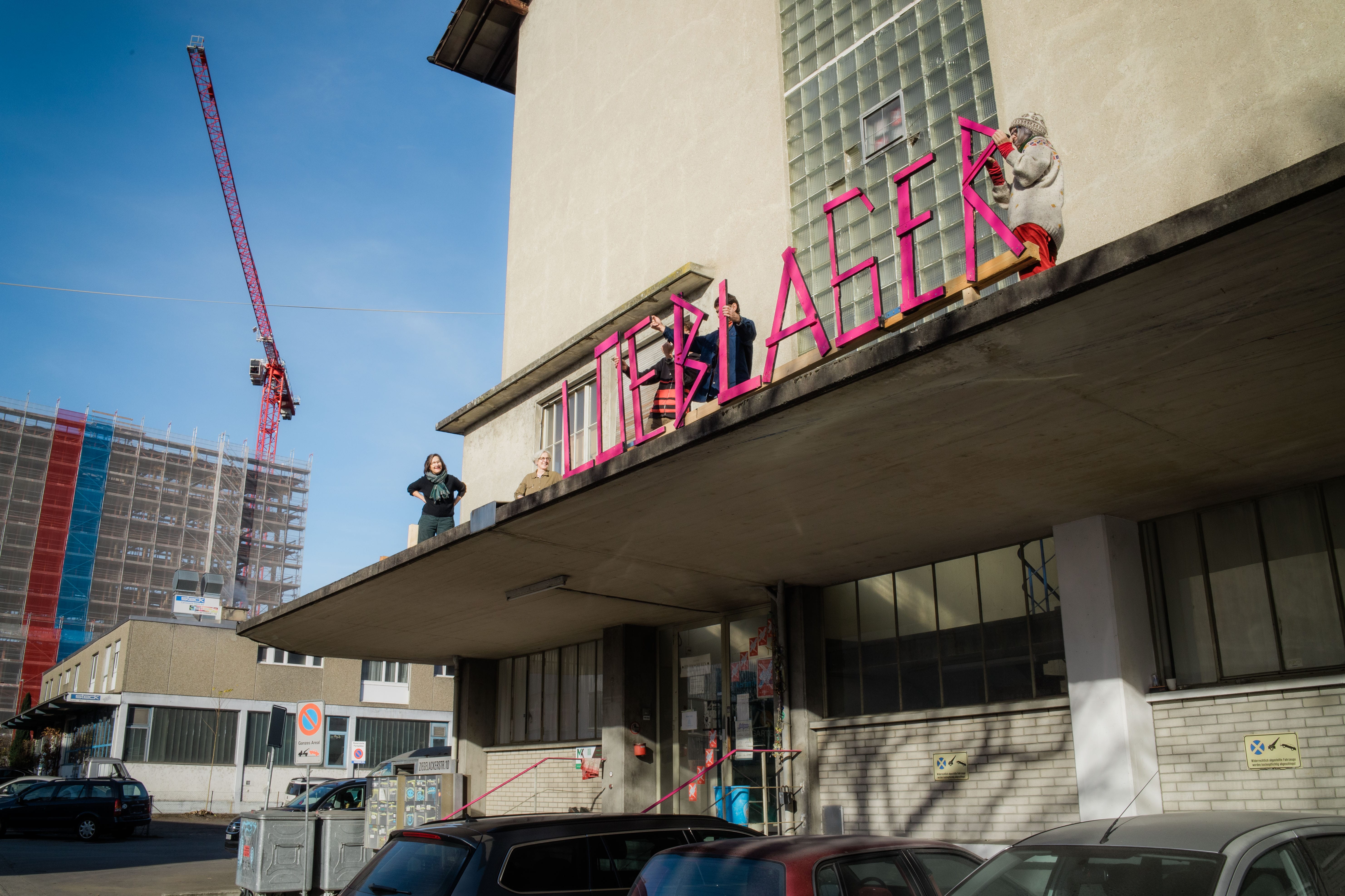 Unübersehbar steht das alte Loeblager auf dem «Weyer-West»-Areal zwischen Mulden, Containern und Kranelementen, die rund um das Gebäude gelagert werden. Als wir beim alten Loeblager ankommen, wird gerade der Schriftzug «LOEBLAGER» in pinken Lettern auf dem Vordach angebracht. Für die anstehenden Tage der offenen Tür will man sich von der besten Seite zeigen.