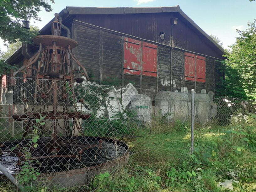 Das nächste Grundstück ist durch einen Gitterzaun abgetrennt. Beim Vorbegehen entdecke ich hinter dem Zaun ein künstlerisches Eisenkonstrukt, das ich an diesem Ort nicht vermutet hätte: Ein beweglicher, mechanischer Brunnen, dessen Gefässe in regelmässigem Abstand durch die Wasserlast nach unten kippen. Verwundert ob der kunstvollen Entdeckung in diesem Perimeter trete ich in die nächste Einfahrt und stehe auf einem grossen Kiesplatz, der von verschiedensten Häuschen umrandet ist. Den Schildern entnehme ich die unterschiedlichen Nutzungen der Häuser: Das grosse Haus links gehört dem «Schweizerischen Schäferhund-Club Ortsgruppe Bern», die Häuser auf dem hinteren Teil des Platzes verweisen auf die «Hornusser Gesellschaft Bern-Beundenfeld.»