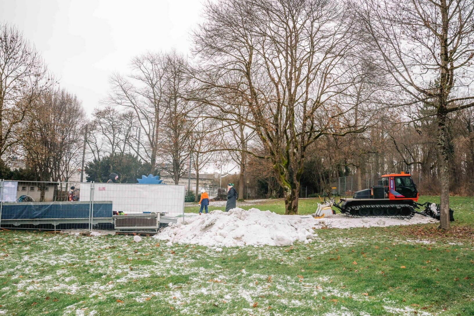 Neben dem angefrorenen Becken, an einem leichten Abhang im hinteren Teil der Badi, präsentiert sie sich: Die kurze Skipiste, präpariert aus dem Abriebmaterial der Kunsteisbahn, inklusive automatischem Förderband alias «Zauberteppich». Ja, sogar ein Pistenfahrzeug gibt es in der Badi.