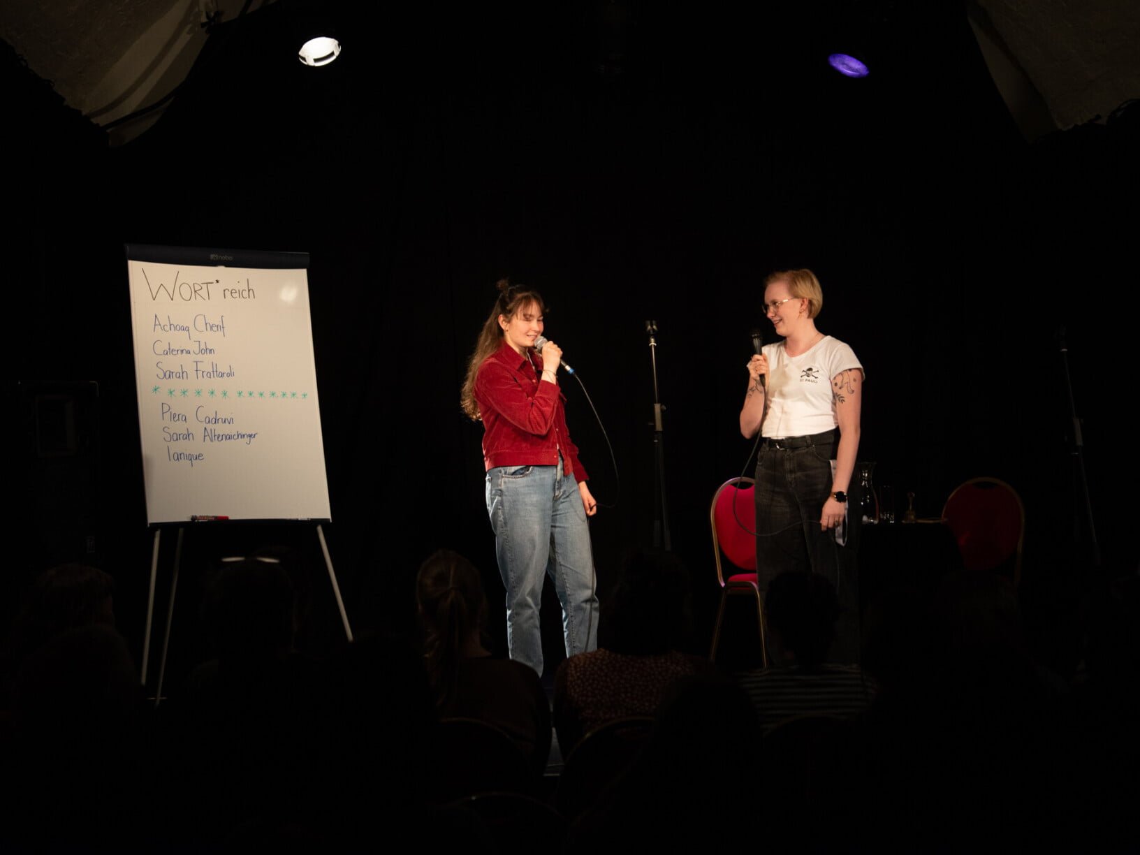 Jessica Brunner (rechts) und Olivia Vera am ersten WORT*reich Slam im VISAVIS. (Foto: Noah Pilloud)