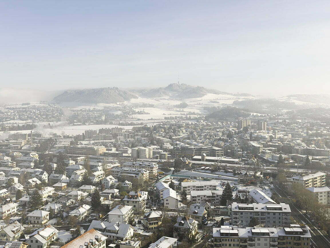 Gemeindefusionen spielen sich auf vielen Ebenen ab. Fotos von der Dachterasse des PTT-Tower zeigen zwei Gemeinden, die ineinander fliessen.