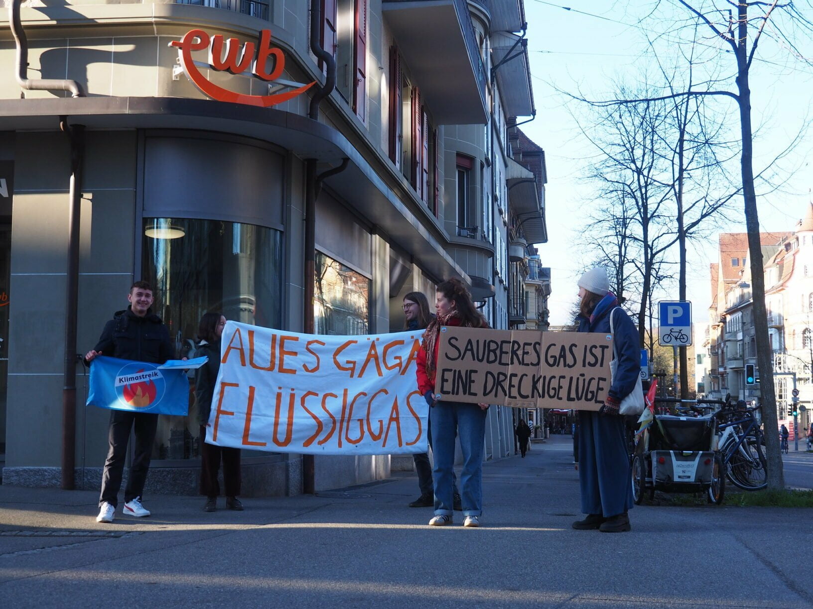 Vor dem Hauptsitz der ewb machten Aktivist*innen auf das geplante Flüssiggasterminal in Schweizerhalle aufmerksam. Unsere Kolumnistin war dabei.