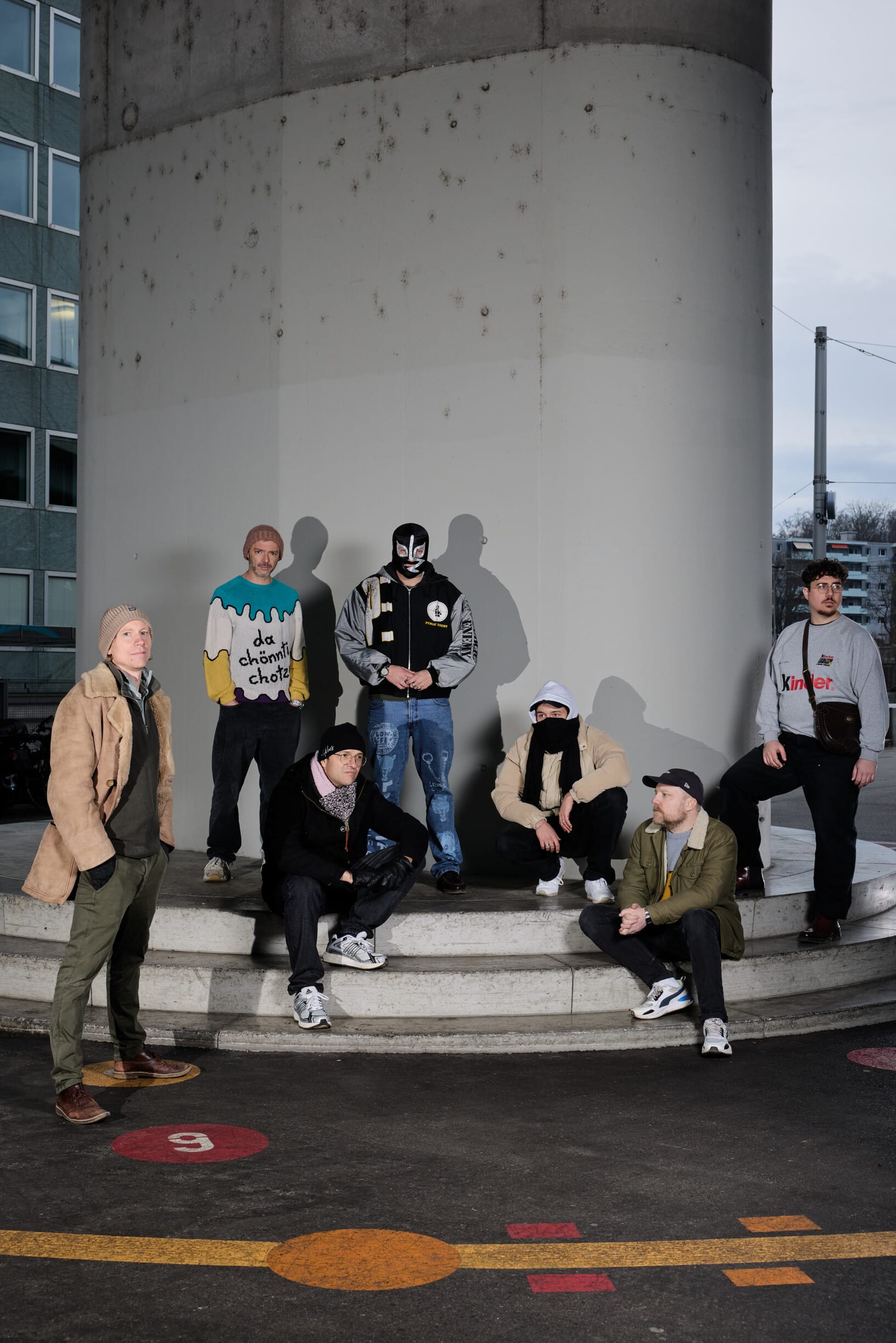 Zwei Berner Rap-Generationen vereint (von links): Pit, Krust, Iroas, Poul Prügu, Fantu, Greis und Migo. (Foto: Yoshiko Kusano)