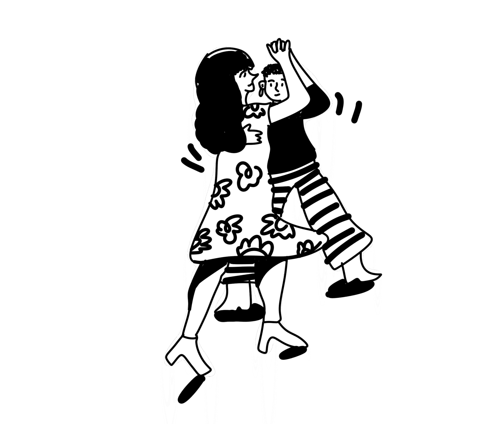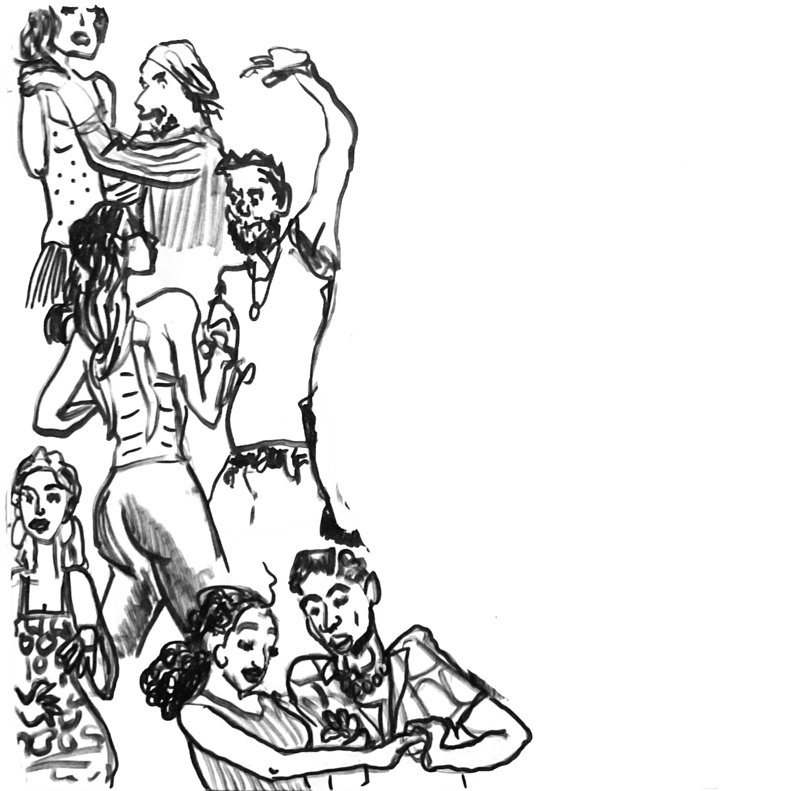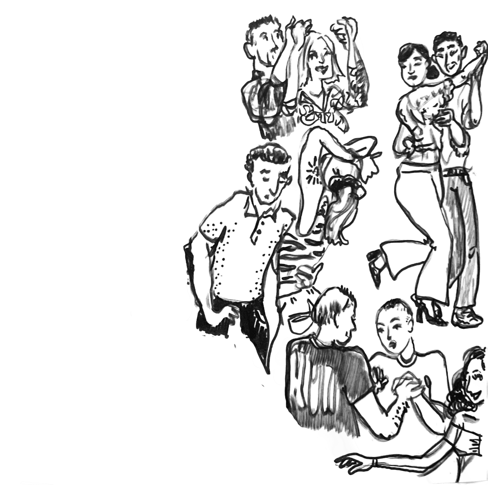 Wir setzen uns auf ein Ledersofa am Rand des Raumes. Sarah Blaser holt ihr Skizzenbuch hervor, ich mein Notizheft. Während sie beginnt, Linien und Bewegungen festzuhalten, schaue ich auf die Tanzfläche. Bald gehe ich selbst hinüber, auch Moe und Alain sind da, die in Bern das Prinzip des Role-Swapping (Journal B berichtete) bekannt gemacht haben, bei dem Leader und Follower ihre Rollen wechseln.