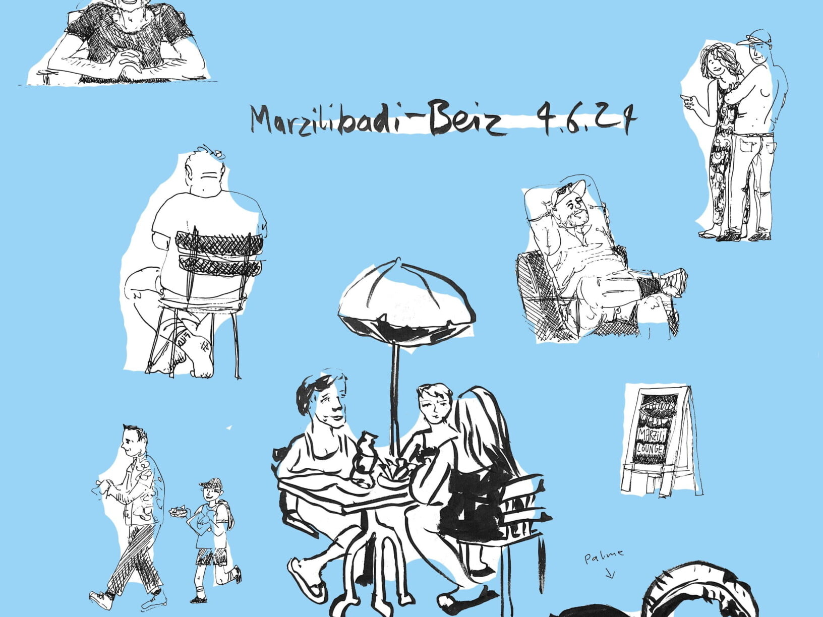 Hier zu zeichnen macht Spass, beide sind oft hier zum Skizzieren, denn die Vielfalt an Körper, Gesichter, Kompositionen sowie Outfits ist riesig. Auf ihrem Lieblingsspielplatz haben David und Sarah heute beschlossen, sich auf die Terrasse des Restaurants zurückzuziehen, um dem Konzept treu zu bleiben. «Sind wir uns einig, dass wir auch Menschen auf dem Gras zeichnen können?» fragt David. «Das geht eindeutig über die Terrasse hinaus… aber da nicht viele Leute da sind, nehmen wir, was wir kriegen können!», antwortet Sarah.