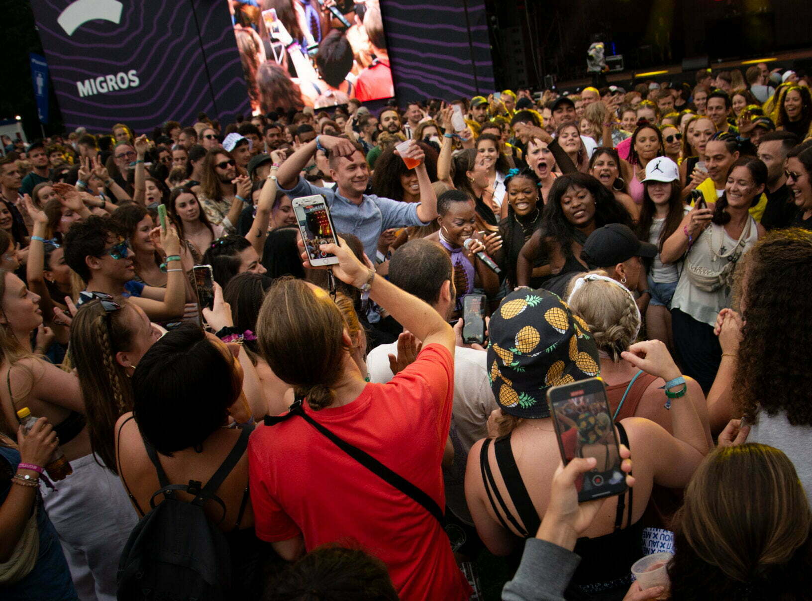 Der Abschluss des Abends findet ebenfalls in der Zeltbühne statt: Deutschrap-Überfliegerin Nina Chuba heizt nochmals so richtig ein. Das Publikum erstreckt sich bis auf die Anhöhe neben der Zeltbühne.